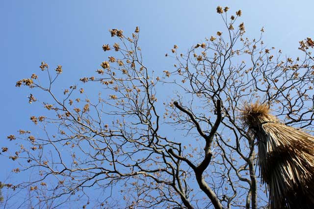 大きな無患子(ムクロジ)の木が空に伸びていて、枝先には実がたくさん付いていました。