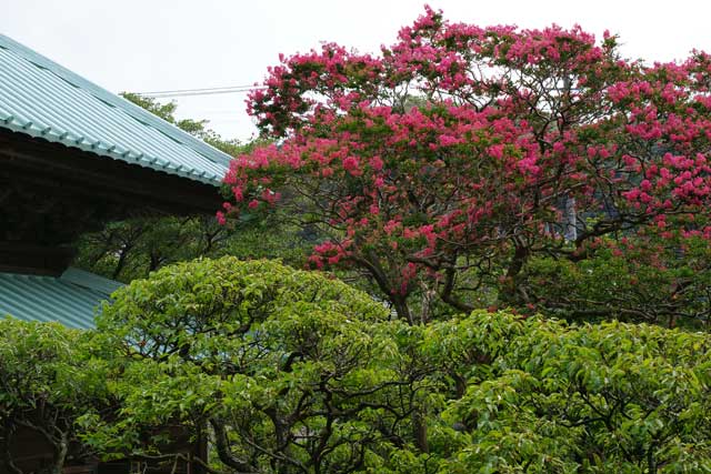横須賀線、大船駅と北鎌倉駅のちょうど中間にある成福寺のサルスベリが満開(写真左)。