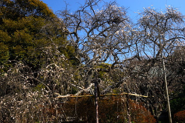 宝戒寺のシダレウメは老木で、あまり花が付いていません(写真左)。