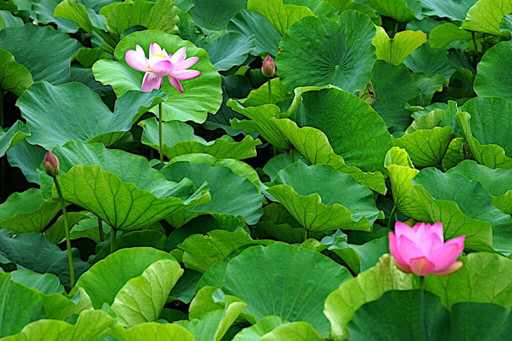 鶴岡八幡宮の源平池のハスが咲き出していました。