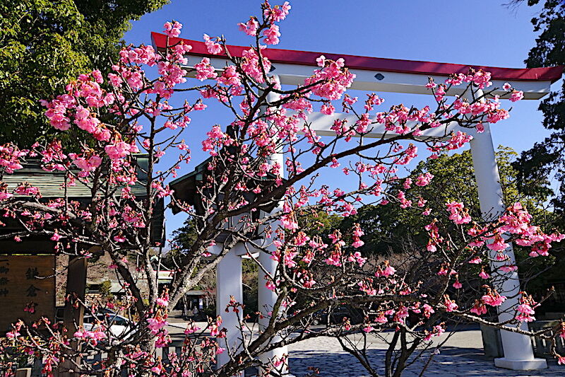 鎌倉宮の鳥居前には河津桜(写真下)が咲いていました。